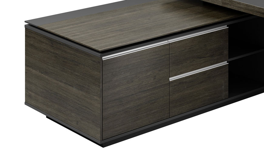 坂木結(jié)合 可見出為油漆,不可見處板材基材:采用中纖板 (均符合環(huán)保要求, 達到新國家檢測標準 E1級);貼面用材:采用 0.6mm進口山核桃天然木皮貼面;山核桃木質(zhì)纖維勻稱中細,外觀厚實寬大,莊重大氣,頗有紫檀風味桌面嵌入不銹鋼飾條曾顯現(xiàn)代感設(shè)計簡約干凈箱體上線,桌面隱藏走線,箱體增加儲物檢修功能/坂木結(jié)合 可見
