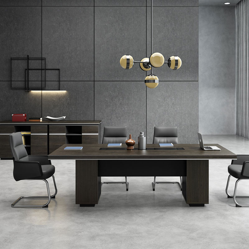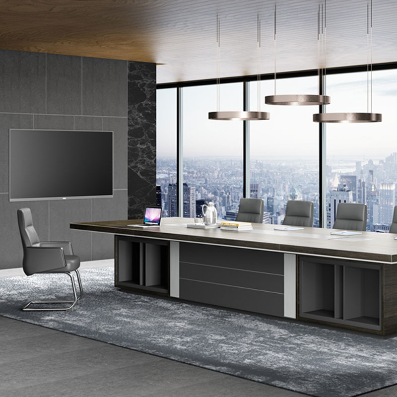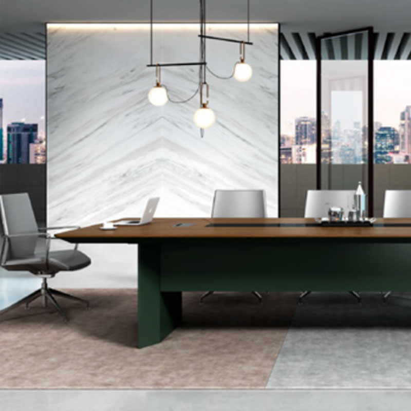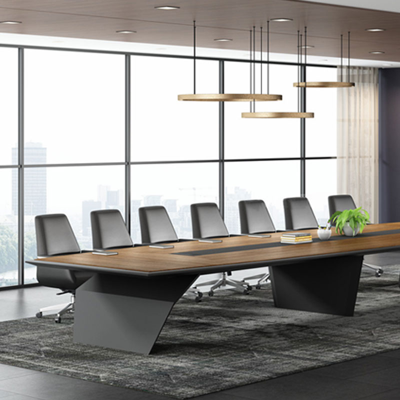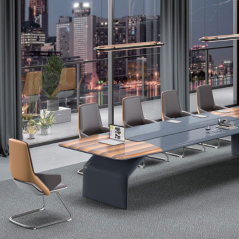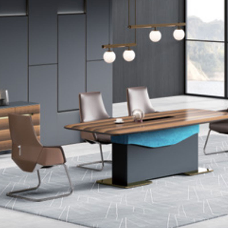 會(huì )議桌坂木結合 可見(jiàn)出為油漆,不可見(jiàn)處板材基材:采用中纖板 (均符合環(huán)保要求, 達到新國家檢測標準 E1級);貼面用材:采用 0.6mm進(jìn)口天然木皮貼面;船型雙層桌板設計,隱藏式走線(xiàn),內嵌皮質(zhì)桌墊會(huì )議桌 折彎桌角,增加了工藝的復雜性/面料:選用意大利"陽(yáng)光"牌小牛皮(1.0mm厚),經(jīng)液態(tài)浸色及防潮、防污等工藝處理