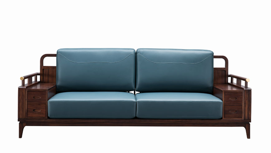 基材采用原木+高泡海綿,頭層皮扶手銅飾點(diǎn)綴,雙人沙發(fā)兩側(cè)帶有抽屜柜烏金木沙發(fā)腳
