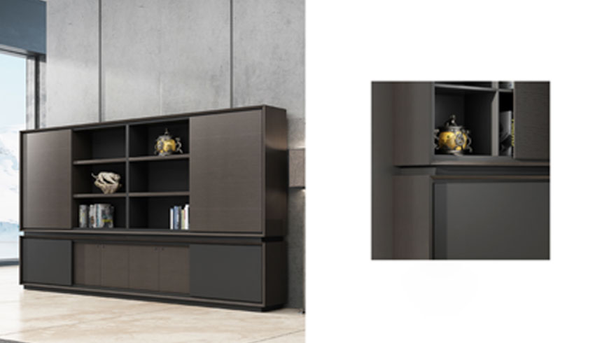 產(chǎn)品板件為E0級MDF板,環(huán)保又耐用 色彩搭配采用主色漢克橡木和輔色碳黑 臺面復合厚度60mm,主臺面為捫皮工藝,輔臺面為漢克橡木,中間用拉絲鋁合金板,板下面有隱藏走線(xiàn)功能,整個(gè)臺 面簡(jiǎn)潔大方,充分展現了產(chǎn)品的高品位氣質(zhì),使產(chǎn)品更加符合時(shí)代的氣息 附柜多處采用45度拼接結構,拉米諾連接方式,外觀(guān)精致, 工藝高端 附柜