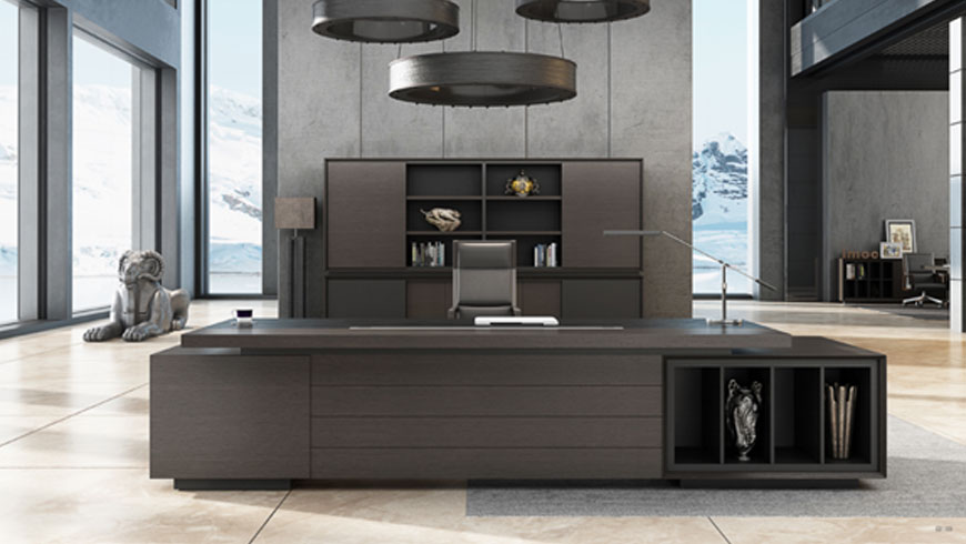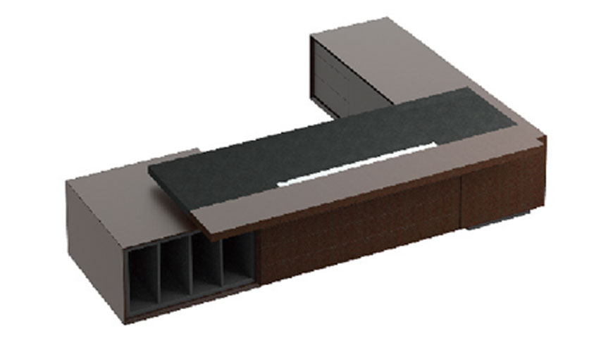產(chǎn)品板件為E0級MDF板,環(huán)保又耐用 色彩搭配采用主色漢克橡木和輔色碳黑 臺面復合厚度60mm,主臺面為捫皮工藝,輔臺面為漢克橡木,中間用拉絲鋁合金板,板下面有隱藏走線(xiàn)功能,整個(gè)臺 面簡(jiǎn)潔大方,充分展現了產(chǎn)品的高品位氣質(zhì),使產(chǎn)品更加符合時(shí)代的氣息 附柜多處采用45度拼接結構,拉米諾連接方式,外觀(guān)精致, 工藝高端 附柜配置5個(gè)抽屜,1個(gè)趟門(mén),1個(gè)掩門(mén),標配3個(gè)86插座安裝 孔位,線(xiàn)路收納等存儲空間 整個(gè)系列選用德國進(jìn)口百隆BLUM配件
