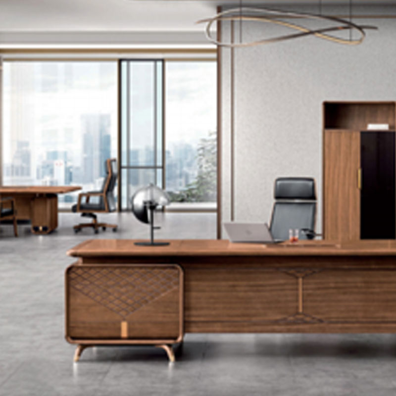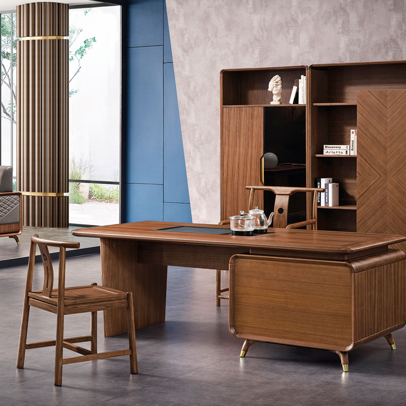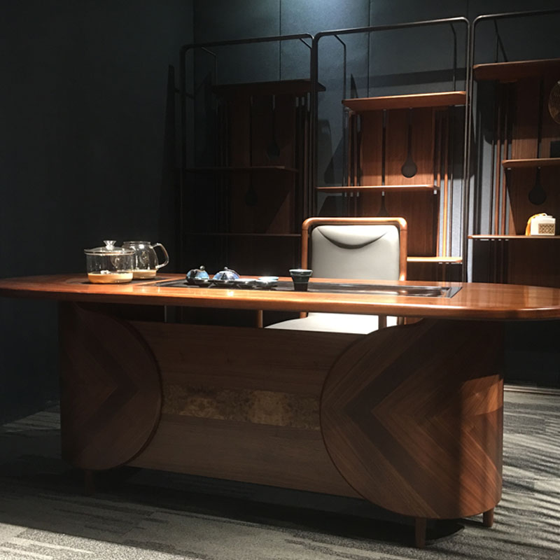 班臺精致爽朗輪廓勁朗豐神俊朗,閃閃透金的小山紋烏金木,飾配銅飾牛皮和雕花,處處流露新中式的韻味;臺面精挑木板花紋,直紋和亂紋按規定拼花以達到完美而又自然效果銅飾整套出模再與片板完美吻合,提高了難度系數門(mén)板銅飾和皮革完美工藝,配備科技感的指紋鎖