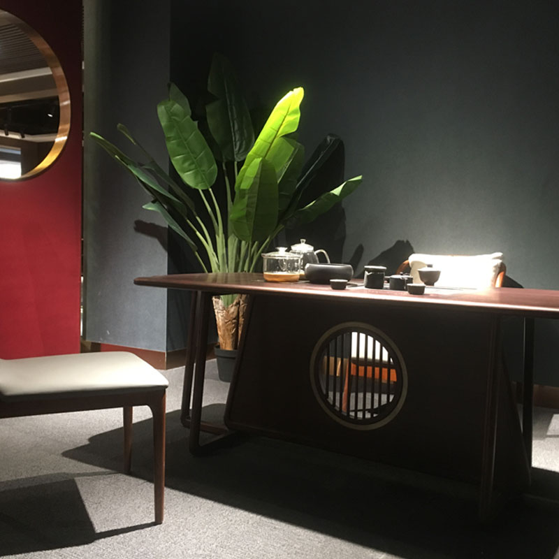 整體采用胡桃多層實(shí)木板,桌板中部鑲嵌火燒石以及煮水設備,可供煮茶桌下采用樹(shù)瘤皮裝飾,實(shí)木腳,整體簡(jiǎn)潔又大方