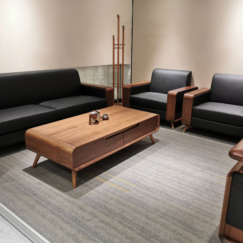 基材采用原木+高泡海綿,頭層皮扶手銅飾點(diǎn)綴,雙人沙發(fā)兩側帶有抽屜柜烏金木沙發(fā)腳